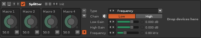 A Splitter works just like a Doofer, but also has the ability to split the audio into two sub-signals, each with their own effect chain. Adding effects and setting up macros works the same as shown above, while the additional controls are as follows: