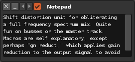 The Notepad is an incredibly simple device for writing notes and placing them within effect chains. You can use them to remind yourself, or inform others, of the functionality of a particular effect chain. They are especially handy for Doofers and Splitters with complex macro mappings, where custom device names may not be informative enough.